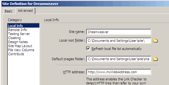 Complicated sites end up with many pages stored in multiple locations. As the designer you get to choose (define) the options for every file. In the Site/Manage Sites menu you will find a list of every site you have created using this machine. (Sites created elsewhere will not show unless you add them to the list manually.) Once a site is selected from the list the menu below appears. This menu should look familiar it is the same on you used to create your site on the last page.