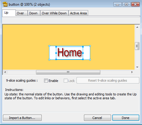 Step 3 - Creating Roll-overs Double click the button. A window will open (seen here) with five tabs. Each tab represents a different state. Up is what the button looks like untouched; over is when the cursor moves over the button, down is clicked; and over-while-down is the visited state. Use the copy button in the lower right to copy the button onto each tab. Then, you can change any property on any tab. Try changing the backgrounds, text colors, and/or adding shadows. Choose done when you are finished. |